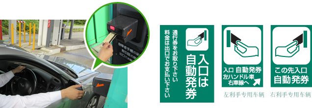 ②在入口收费站,从自动售票机取得您的收费通行券。票券上会显示车辆分类、入口交汇处的名称、发行日期和时间及其他信息。(*部分入口收费站允许现金支付)